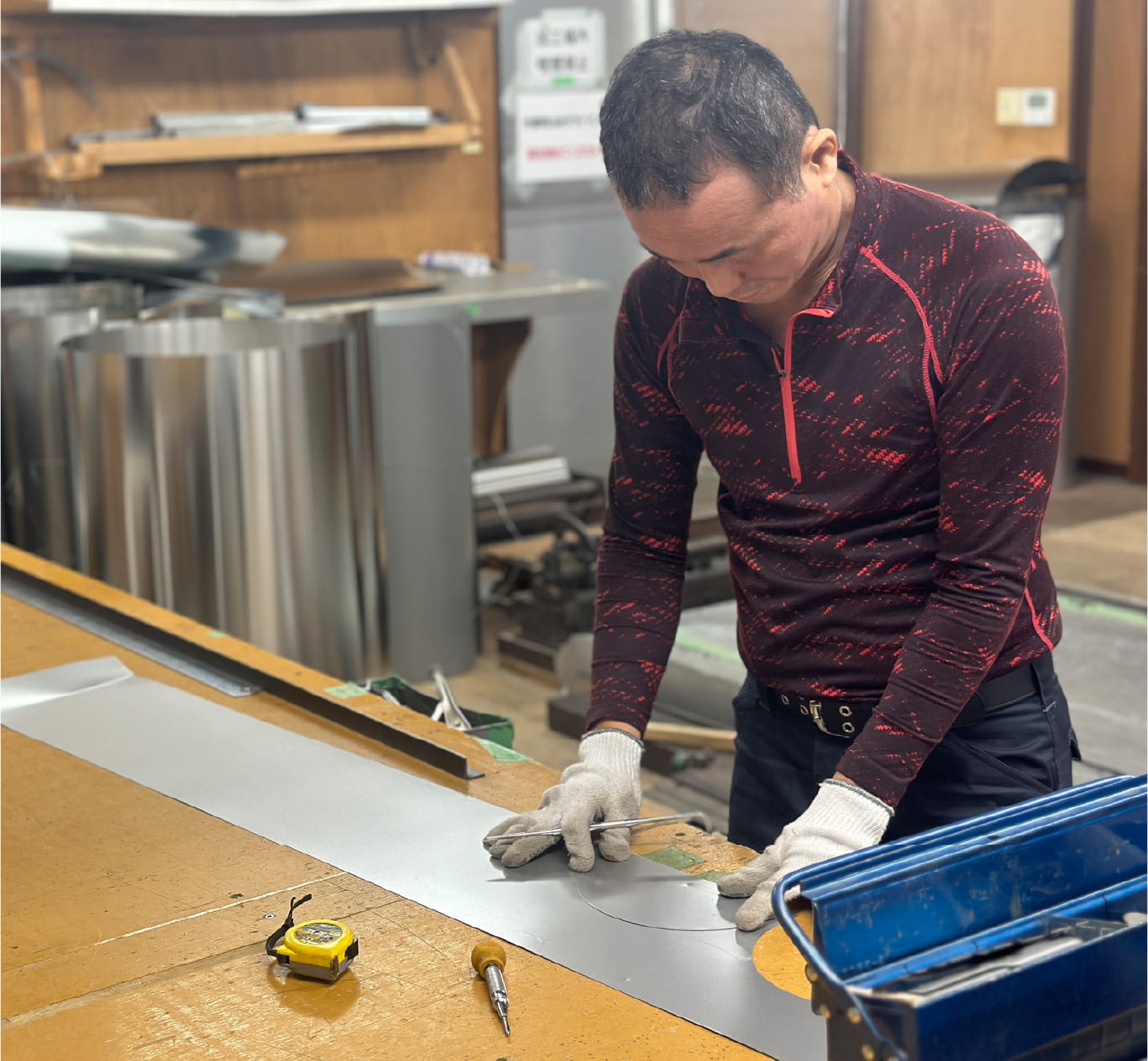 板金工事や保温工事はそれぞれ別の業者が請け負うのが一般的ですが、大宮板金では全ての工程に一貫して関わります。覚えることが多く大変な面もある一方で、経験を積みながら幅広い技術を習得できるやりがいがありますよ!