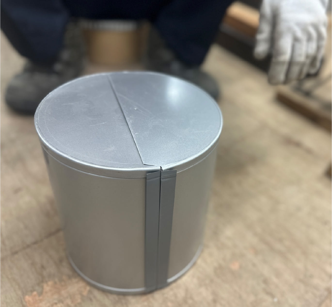 そして、保温工事の仕上げとして行われるのが、施工した保温材の劣化などを抑えるための板金工事。金属の板を加工してカバーを作り、それを表面に取り付けることで、保温材に覆われた設備を外部の浸食から守ります。